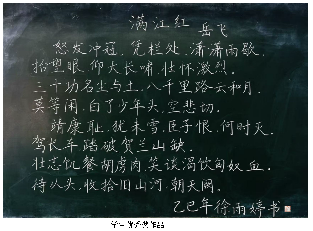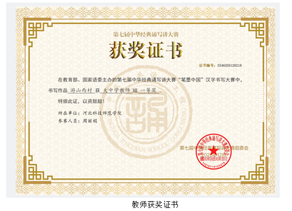 其中,周丽娟老师的粉笔字作品《游西山村》荣获大中学教师组一等奖,也是本届比赛中河北省唯一获此等级奖项的教师。徐雨婷、余青烨两位同学分获大学生组粉笔字与硬笔字优秀奖。